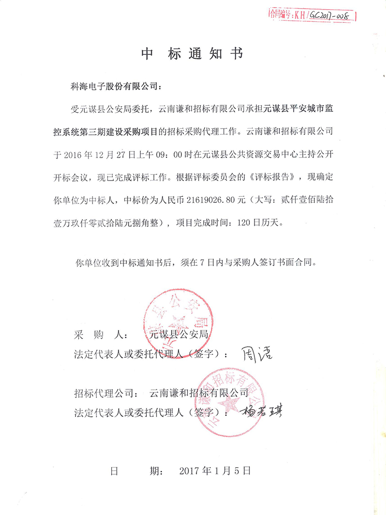 正值寒冬季節,美麗的昆明依然陽光普照、溫暖如春,我公司也如同這燦爛的天氣一般,在年末收官之際頻獲喜訊。科海電子股份有限公司再次憑借著雄厚的技術力量和良好的信譽于2016年12月28日順利中標“元謀縣平安城市控系統第三期建設采購項目”,中標金額:21619026.80元。